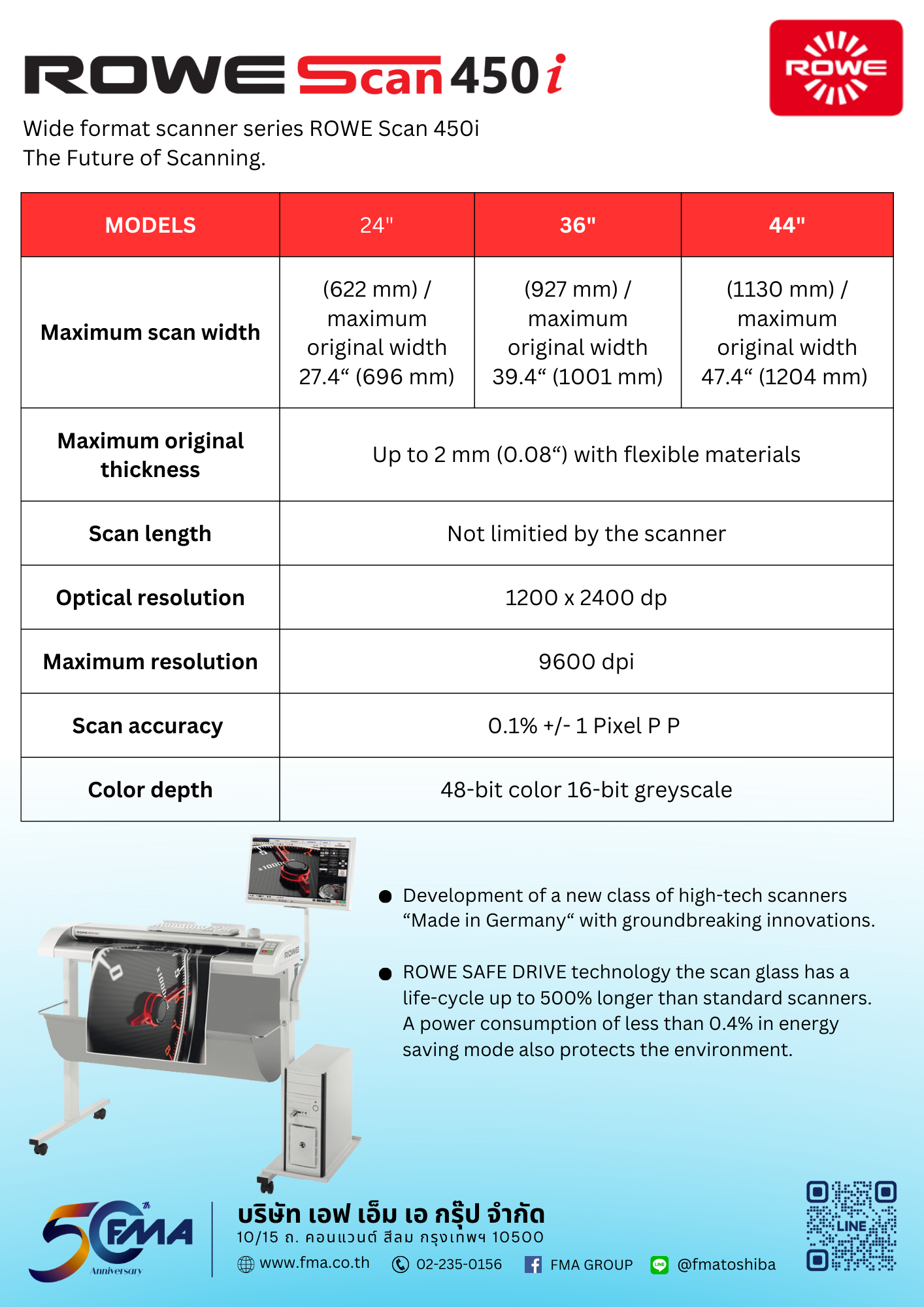 Wide format scanner series ROWE Scan 450i The Future of Scanning. ROWE Scan 450i ประกอบด้วยกัน 3 รุ่น ซึ่งรองรับขนาดหน้ากว้างสำหรับสแกน 24 นิ้ว, 36 นิ้ว และ 44 นิ้ว ที่มาพร้อมกับมาตรฐานงานสแกนระดับ SuperSpeed USB3.0 + RES เสริมศักยภาพด้วยเทคโนโลยี ROWE ScanCloud และ ROWE ScanMatrix+ ซึ่งโดดเด่นเฉพาะตัวและได้การยอมรับระดับโลก ยกระดับความสามารถในการสแกนด้วยสิทธิบัตรเทคโนโลยี ROWE PRO LOGIC ที่ช่วยพัฒนาผลลัพธ์งานแสกนได้ แม้ความคมชัดของต้นฉบับจืดจาง และผลงานสีสันดุจธรรมชาติ ด้วย ROWE SELECTED TRUE LIGHT